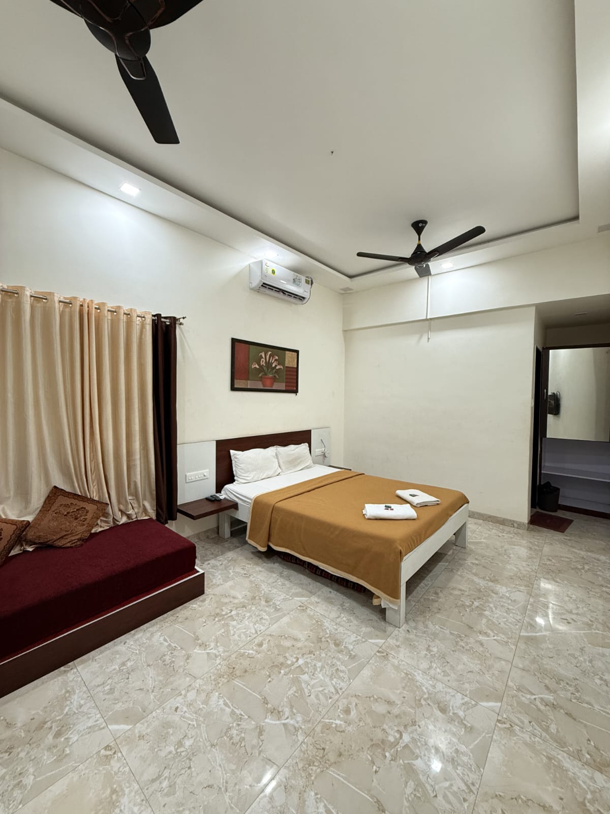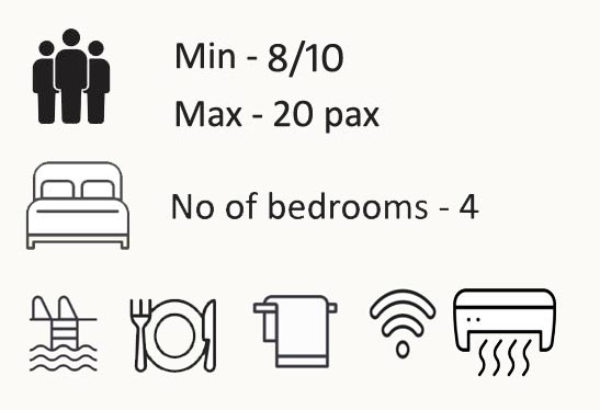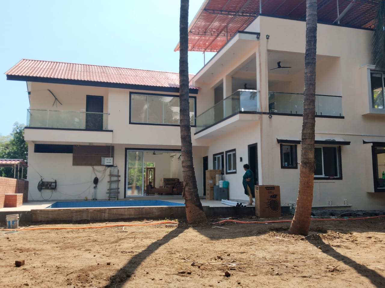 Palm Pristine villa is a spacious four-bedroom villa situated in Nagaon, Alibaug. It is a luxury villa featuring private swimming pool, fully air-conditioned rooms, lush green garden spaces and modern amenities. Inverter back (partial) during power cuts.