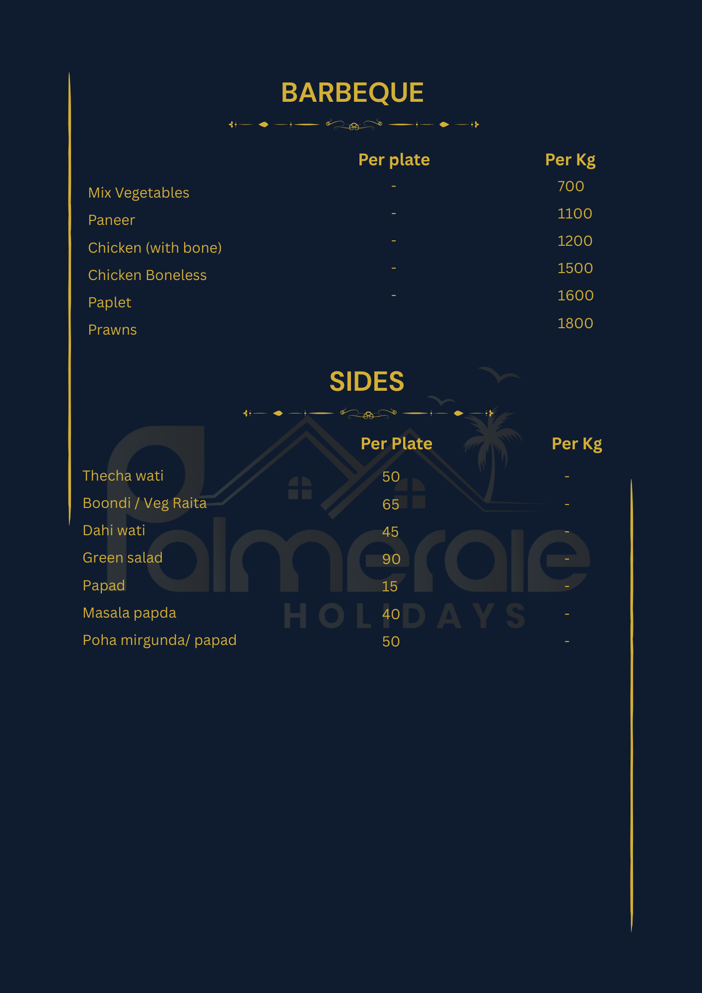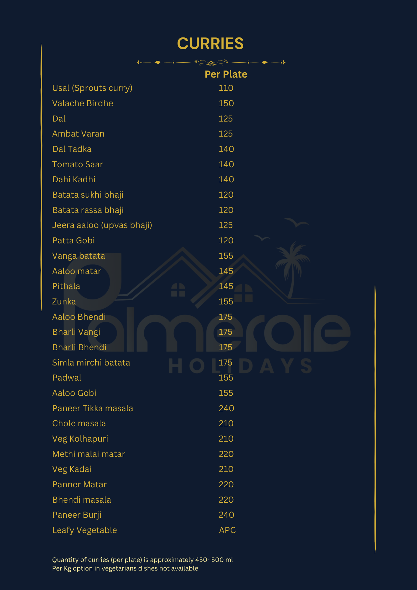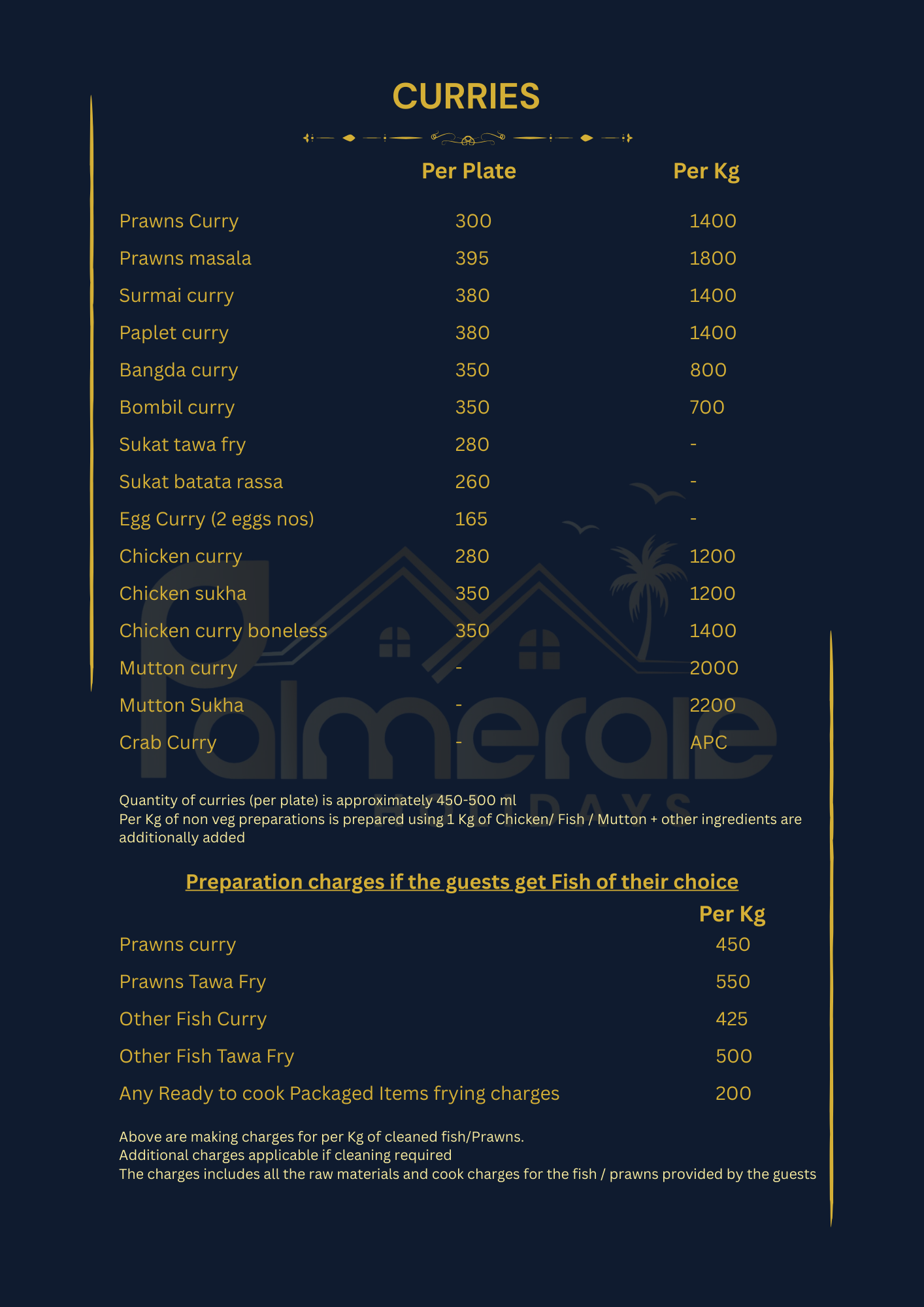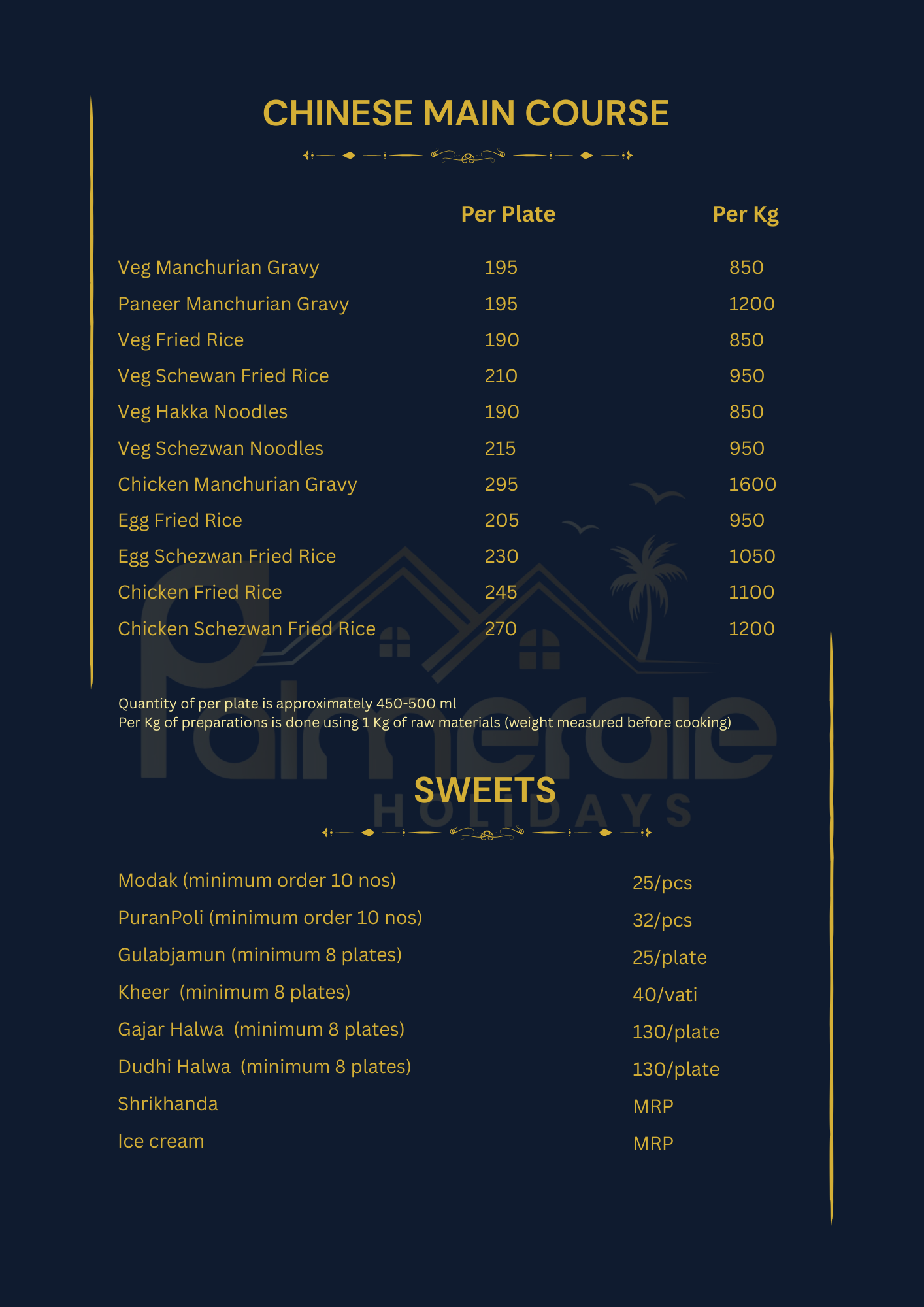 We have created an exciting spread to match your requirements. All the menu items listed reflect the local flavor and are deliciously prepared in-house, using locally sourced, fresh ingredients. Our kitchen is managed by Tanish & Yadvi Catering, which exclusively serves meals prepared in our in-house kitchen for the Palmeraie family. Since we would be cooking only for your group, let us know if you have any specific instructions that need to be followed beforehand. Please note that all dishes, including Punjabi and Chinese dishes, are prepared with locally sourced ingredients and spices, would give you a hint of Alibaug flavour. Please note that since we do not add MSG/aginomoto or food colour in our Punjabi / Chinese dishes, you will get a homemade touch for these dishes.