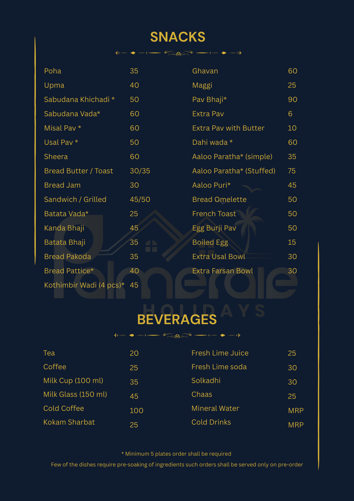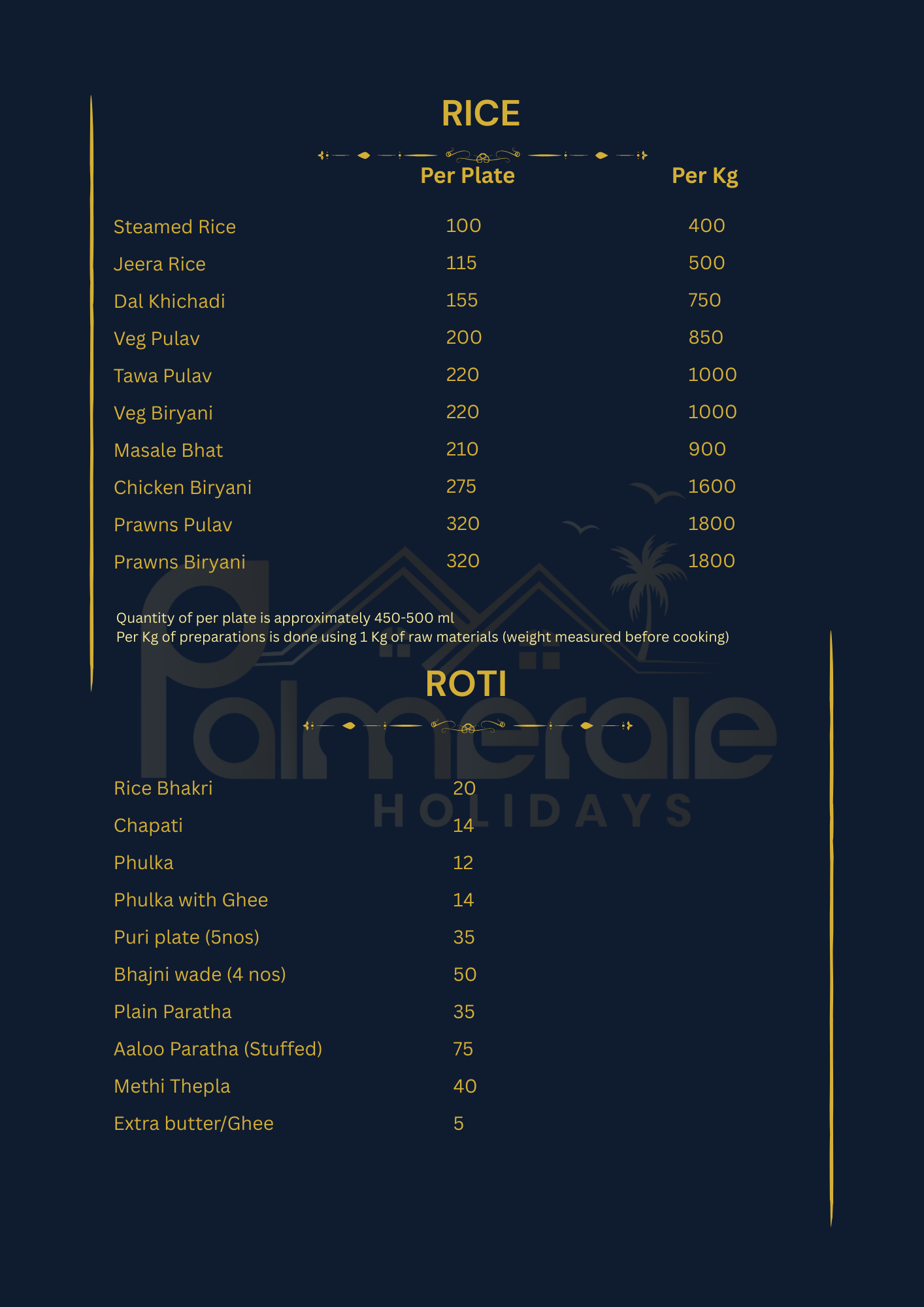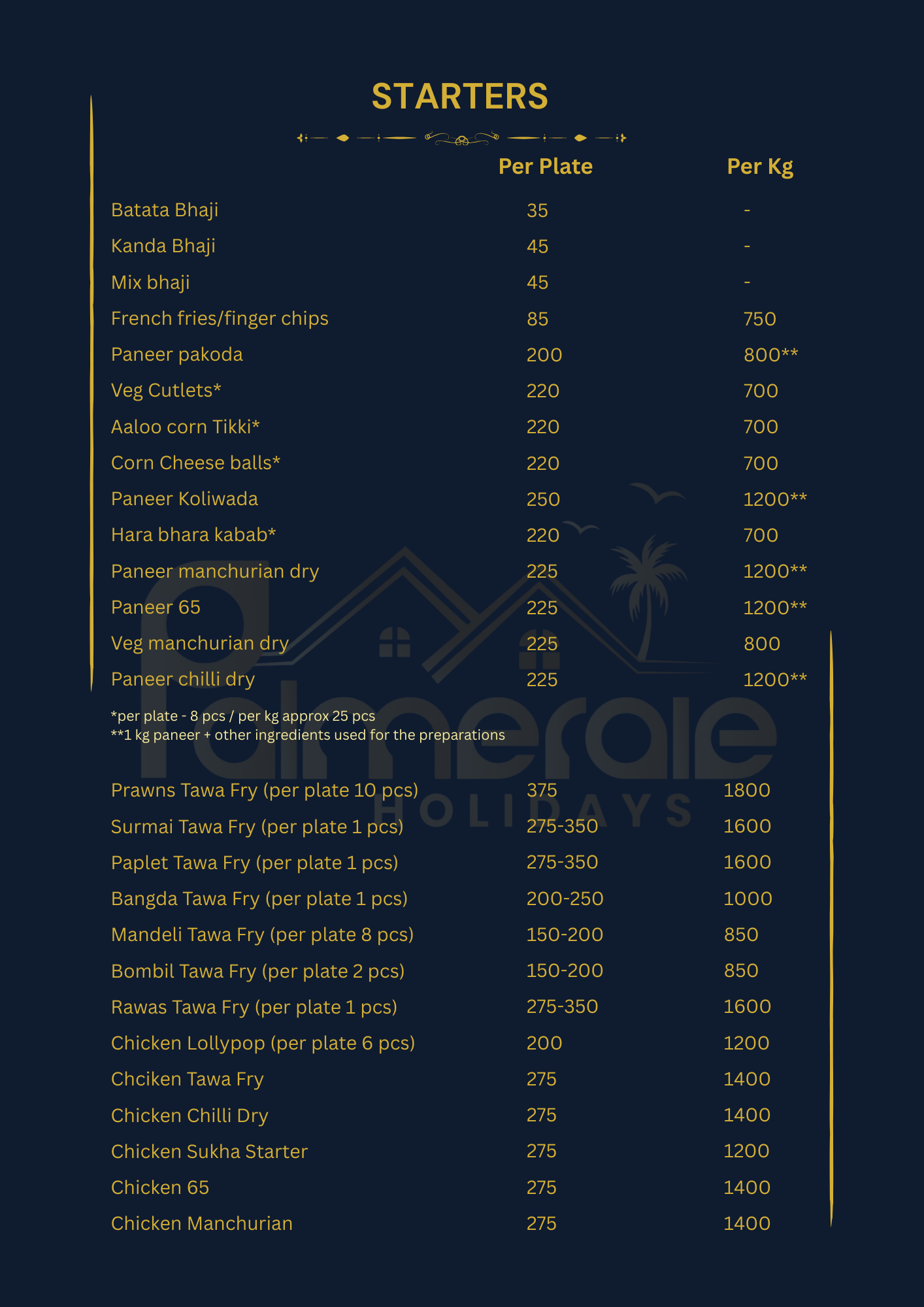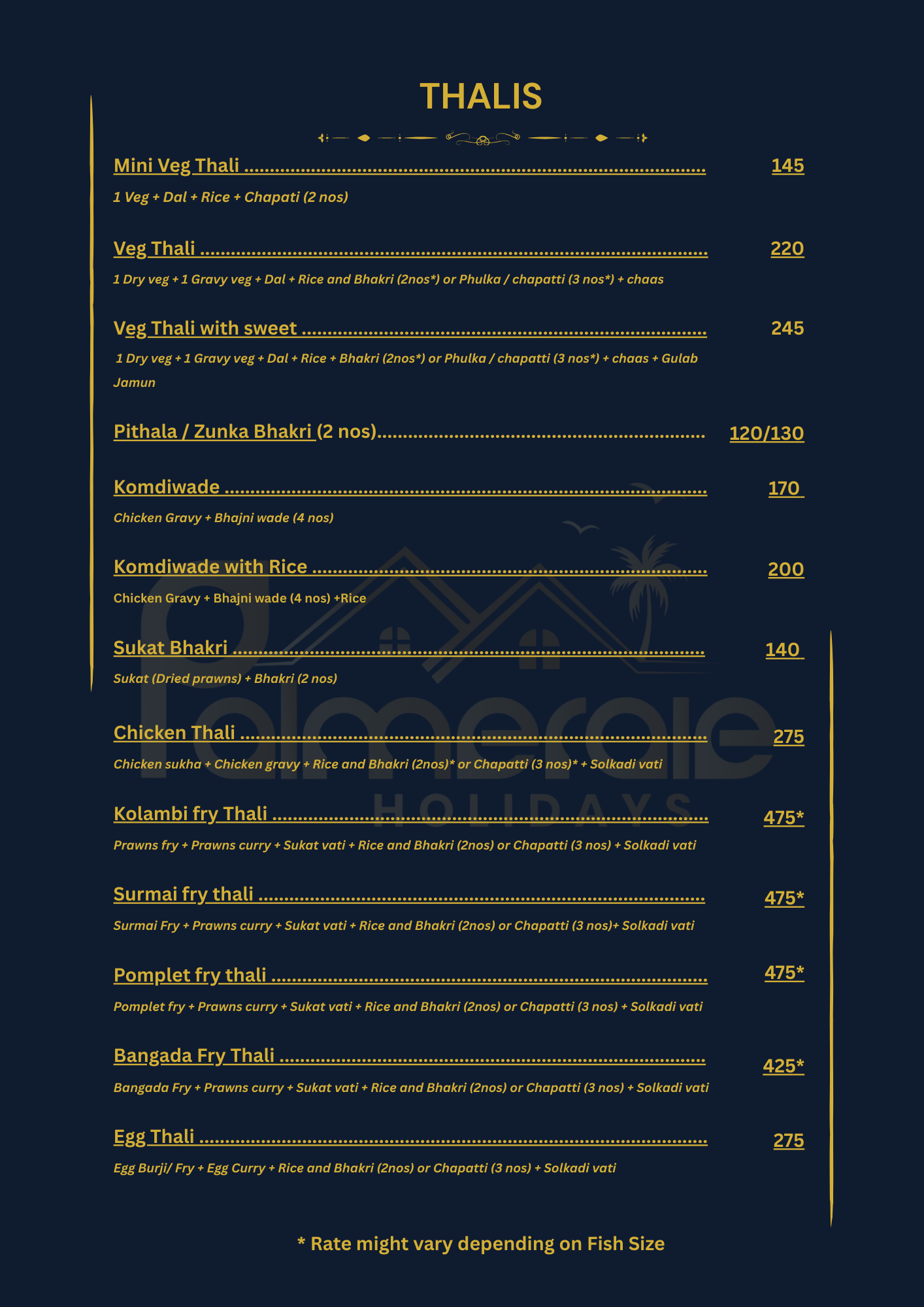 We have created an exciting spread to match your requirements. All the menu items listed reflect the local flavor and are deliciously prepared in-house, using locally sourced, fresh ingredients. Our kitchen is managed by Tanish & Yadvi Catering, which exclusively serves meals prepared in our in-house kitchen for the Palmeraie family. Since we would be cooking only for your group, let us know if you have any specific instructions that need to be followed beforehand. Please note that all dishes, including Punjabi and Chinese dishes, are prepared with locally sourced ingredients and spices, would give you a hint of Alibaug flavour. Please note that since we do not add MSG/aginomoto or food colour in our Punjabi / Chinese dishes, you will get a homemade touch for these dishes.