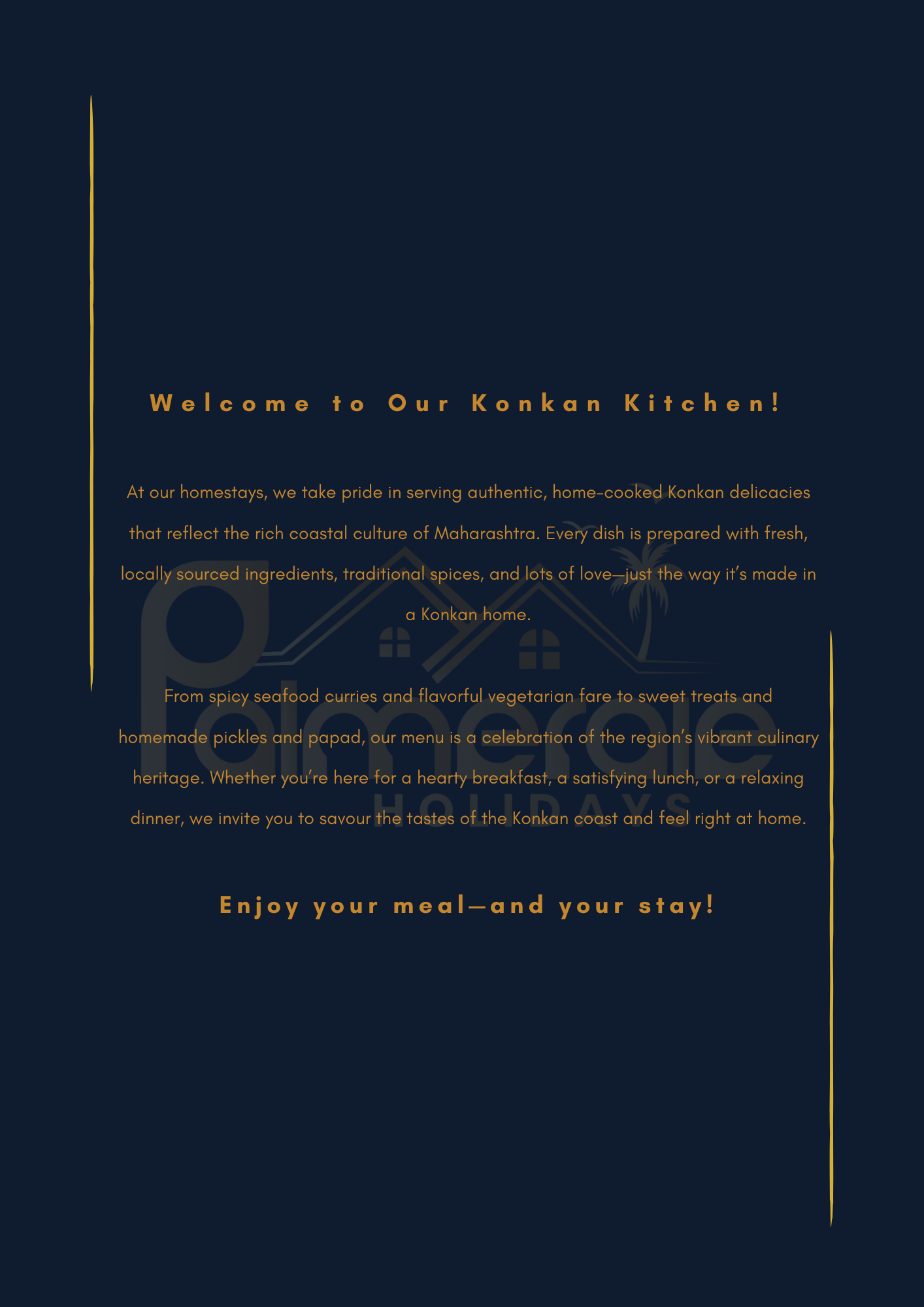 From spicy seafood curries and flavorful vegetarian fare to sweet treats and homemade pickles and papad, our menu is a celebration of the region’s vibrant culinary heritage. Whether you’re here for a hearty breakfast, a satisfying lunch, or a relaxing dinner, we invite you to savour the tastes of the Konkan coast and feel right at home.